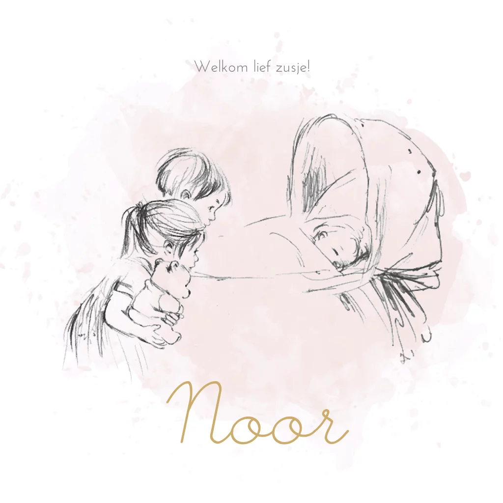 Geboortekaartje 3e kindje meisje in een wieg van pentekening . Kindjes kijken over de rand van de wieg met een roze waterverfvlek en confetti. (21956) Geboortekaartje Noor