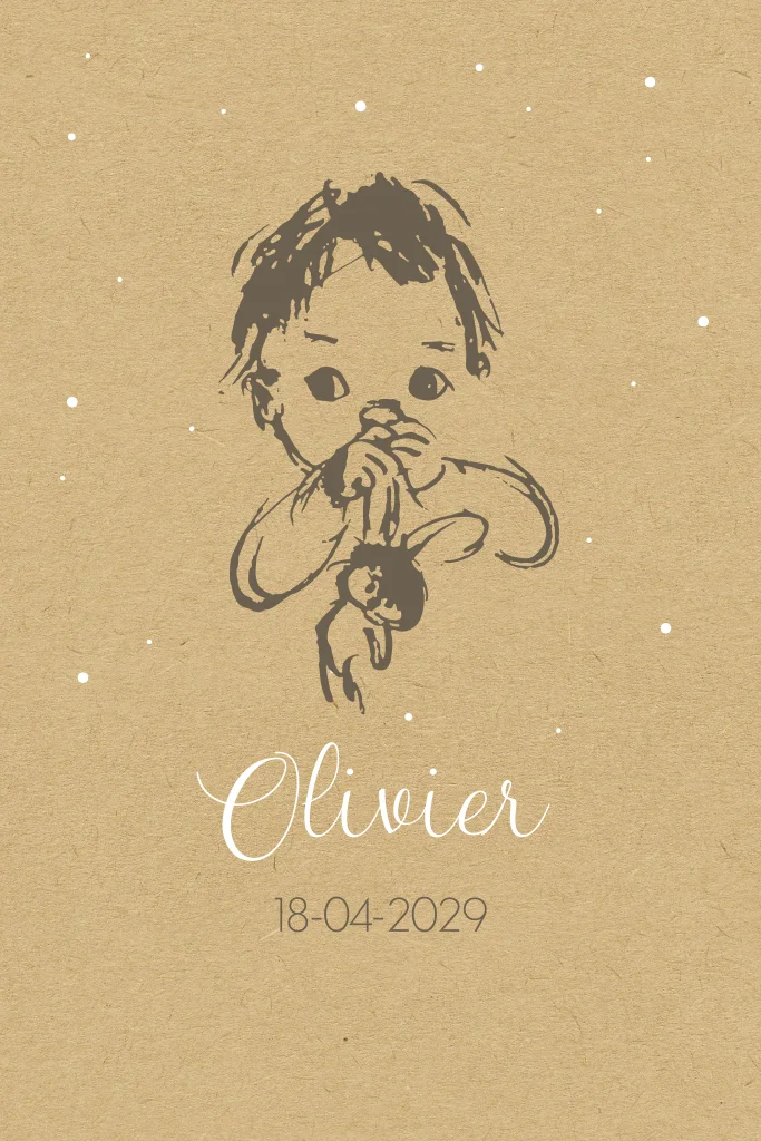 Geboortekaartje met een pentekening van een baby met knuffel in bruindruk op kraft look achtergrond met witte stippen. (22035).Deze kaart is nu voorzien van ronde hoeken (meerprijs € 0,30). Wil je rechte hoeken? Zet het om bij achtergrond in de kaartenmaker.