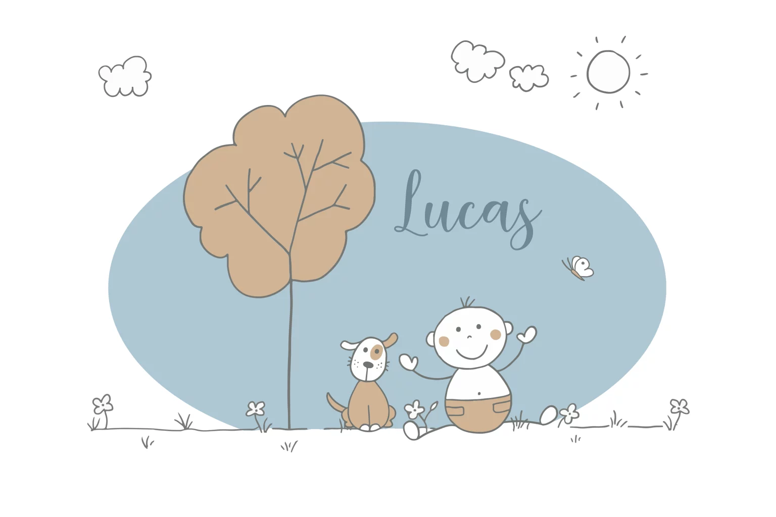 Geboortekaartje voor een jongen met een vrolijke baby met hond bij een boom met een blauw ovaal in de achtergrond. (23517)