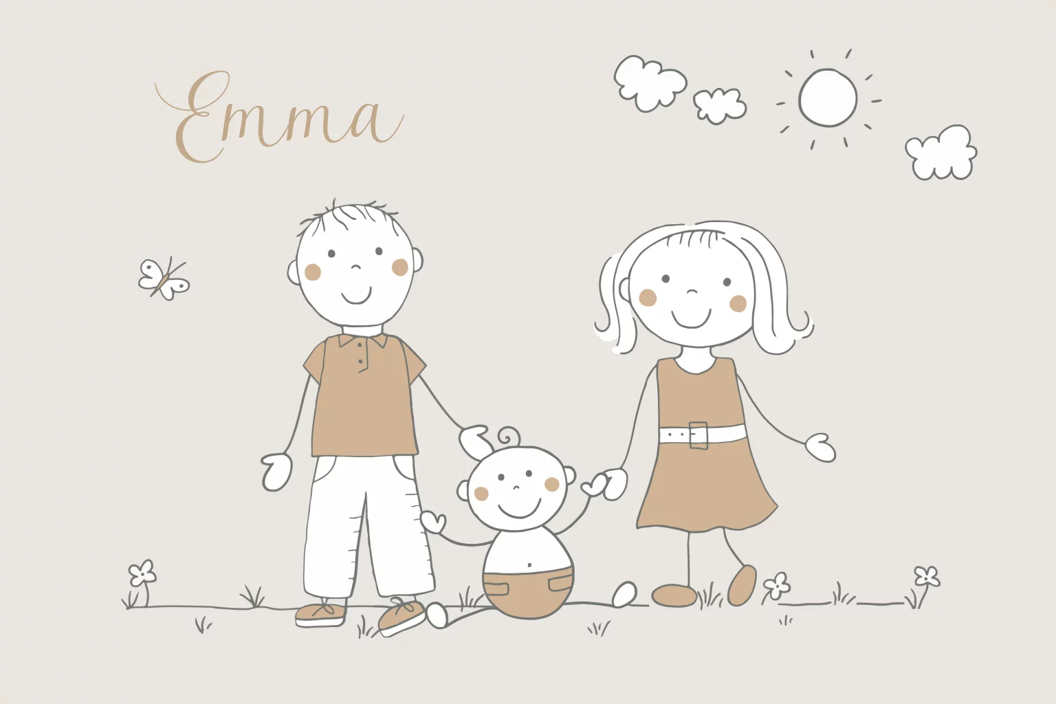 Vrolijk geboortekaartje met een baby zittend tussen papa en mama met een vlinder, gras, wolkjes en de zon op een grijs/bruine achtergrond. (23513)