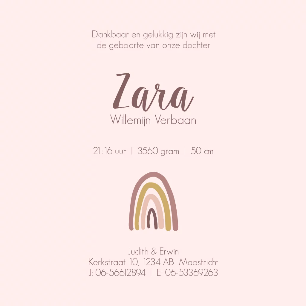 Geboortekaartje roze met een lief getekende hertje en een regenboog op een lichtroze achtergrond. (21953)
