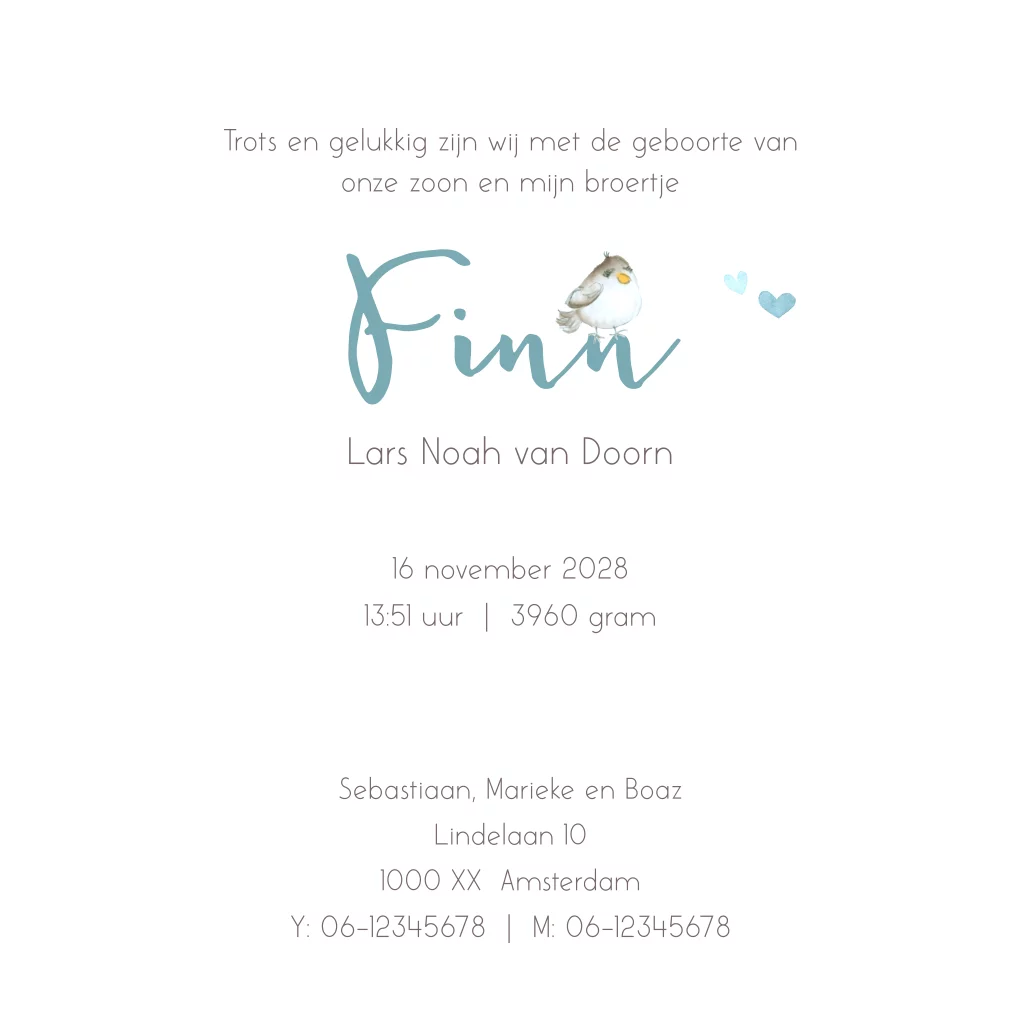 Jongens Geboortekaartje Olifantje met een vogeltje op zijn slurf, maar ook met een vlinder, vogel, lieveheersbeestje, slak, kleine blauwe hartjes en blauwe watercolor in de achtergrond. (24016)