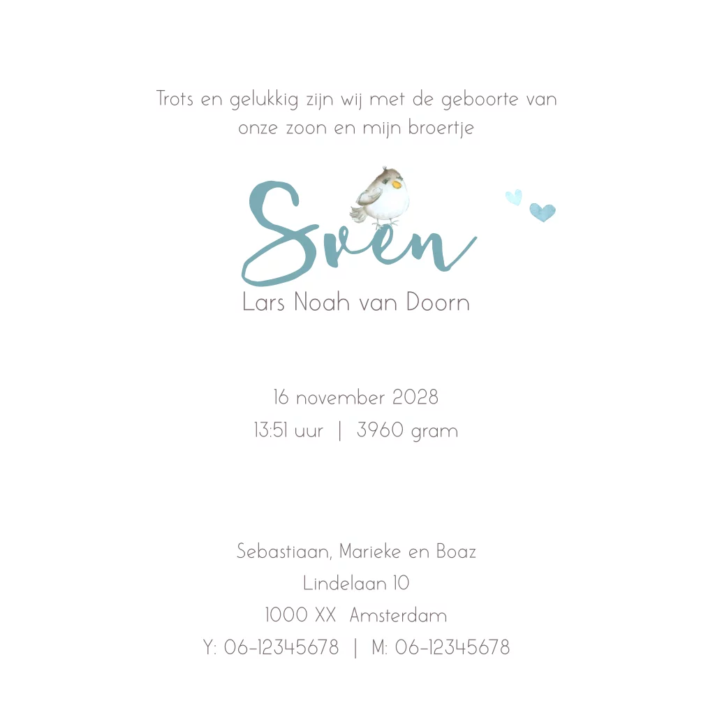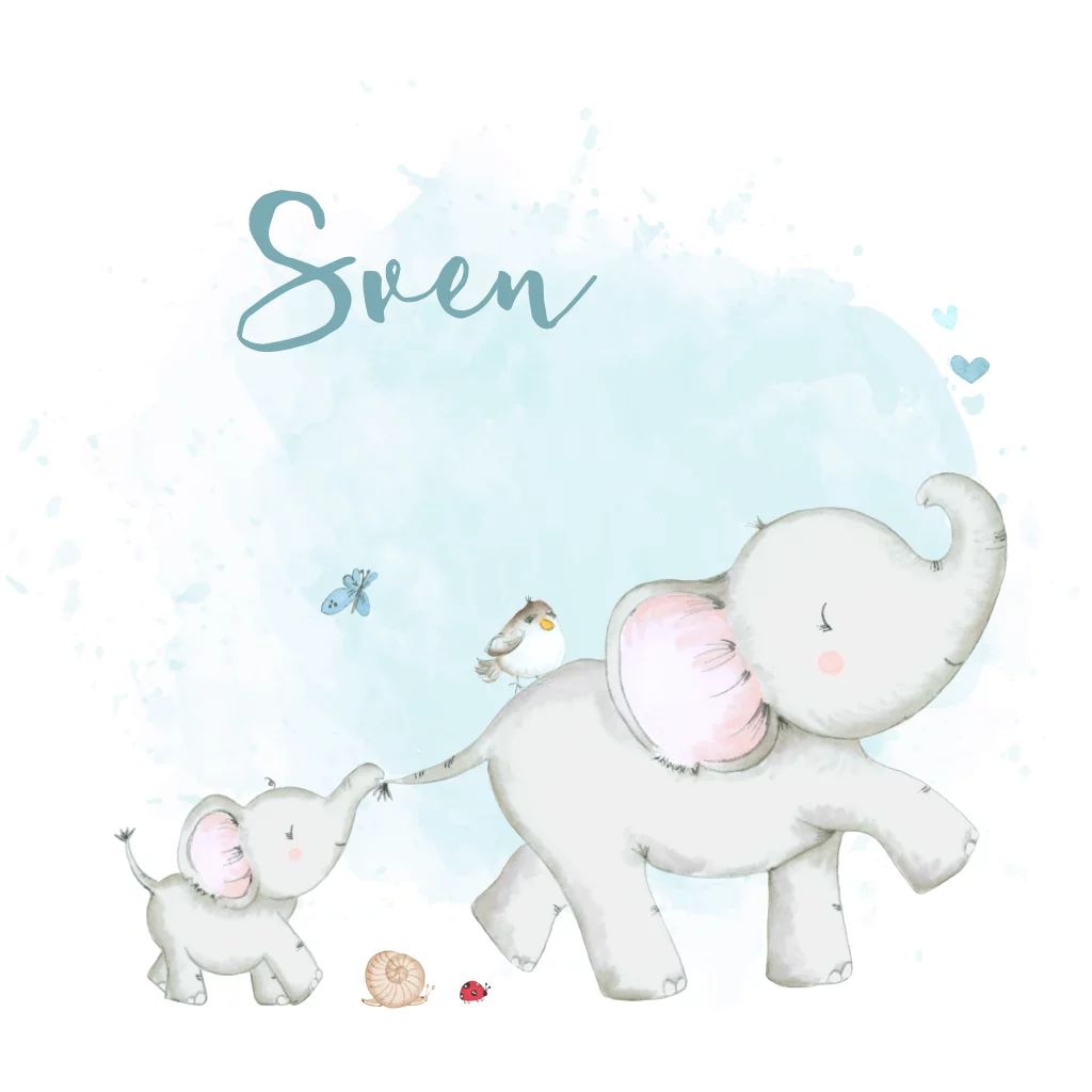 Geboortekaart voor de geboorte van een zoon met een baby olifantje achter een grotere olifant met een vlinder, vogel, lieveheersbeestje, slak, kleine blauwe hartjes en blauwe watercolor in de achtergrond. (24016)