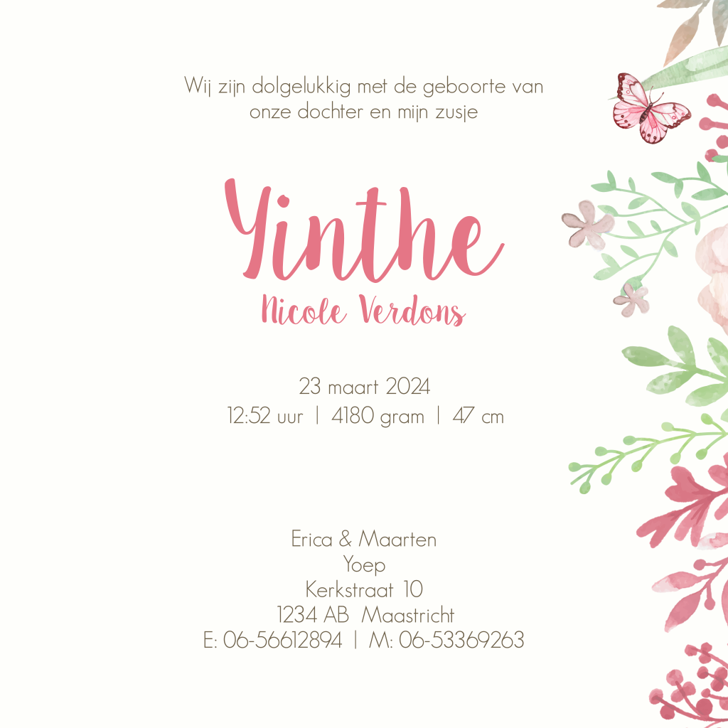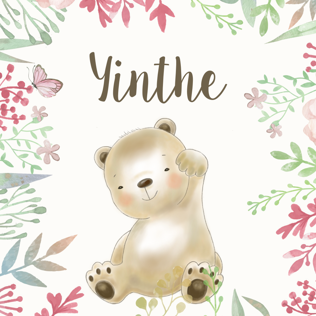 Geboortekaartje voor de geboorte van een dochter met de afbeelding van een lieve beer en roze vlinder in een bloemenkader. (22475)