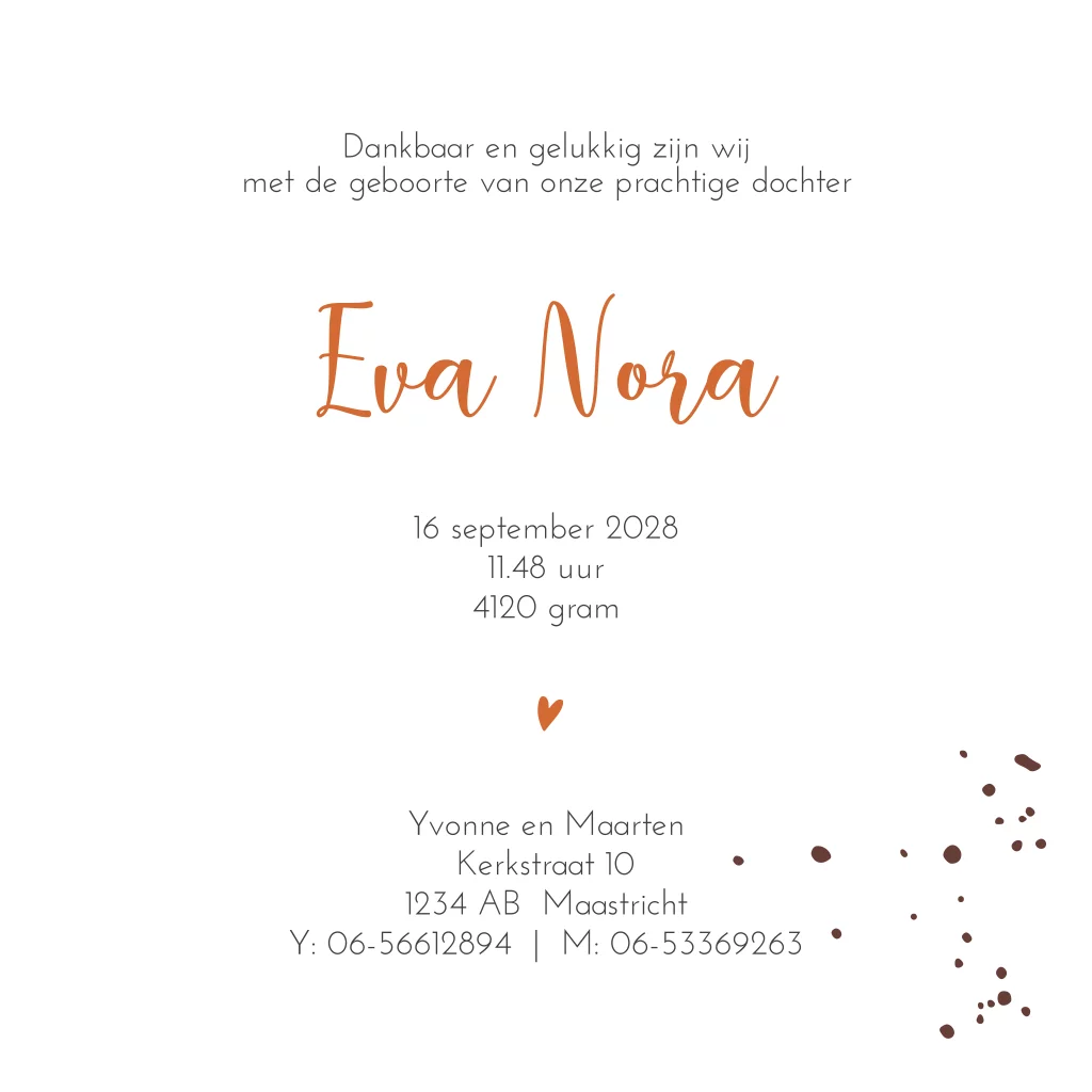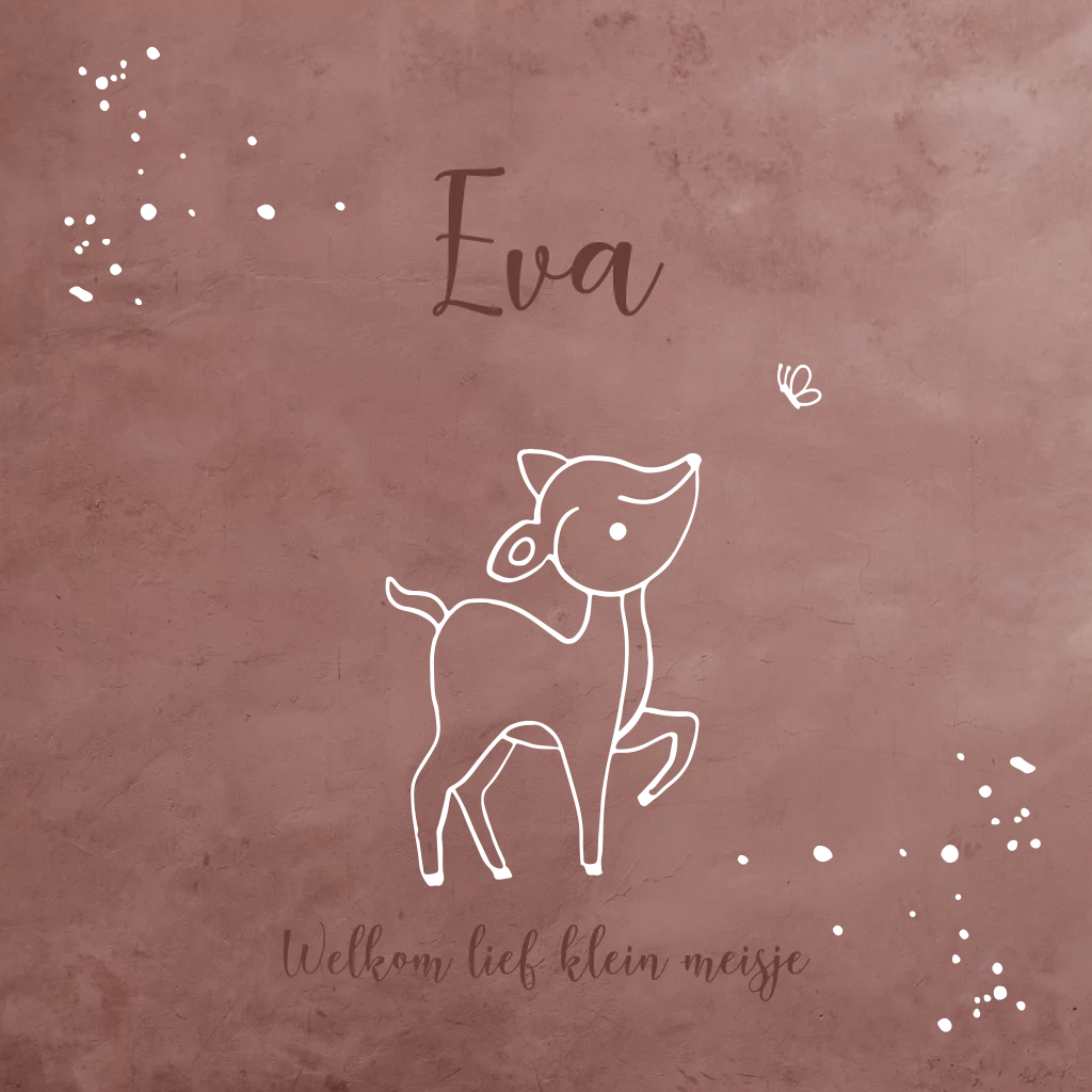 Geboortekaartje voor een meisje met een hertje, vlinder en spatten in foliedruk op een betonlook achtergrond. (24107) Geboortekaartje naam Eva.