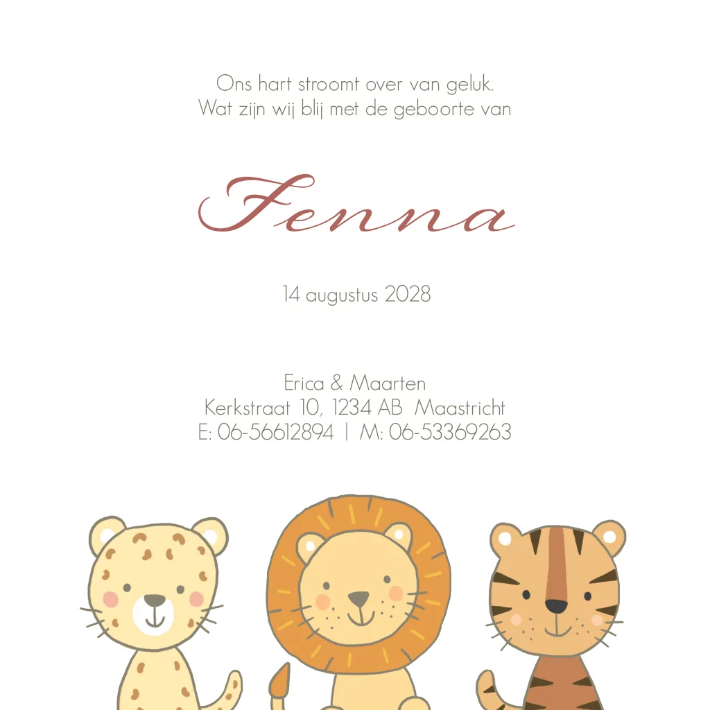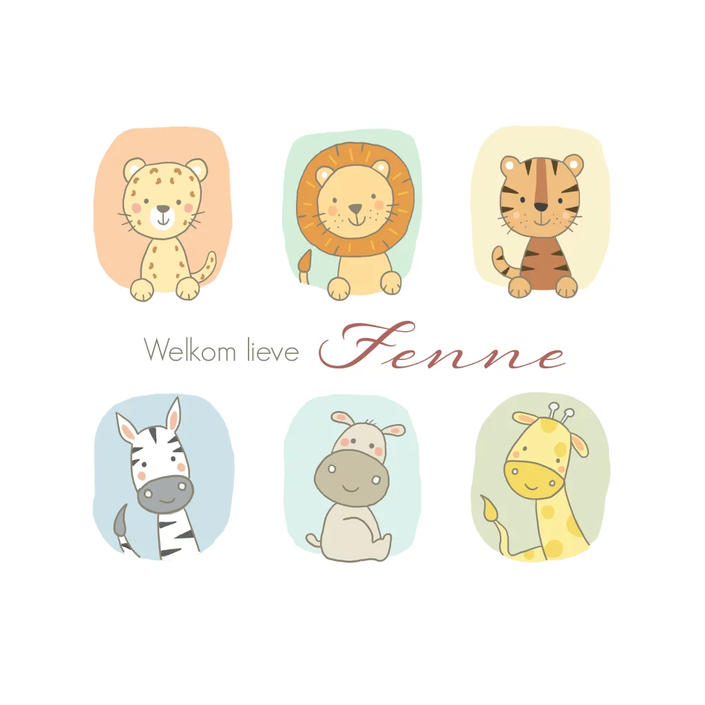 Geboortekaartje meisje neutraal safaridieren in gekleurde vlakjes