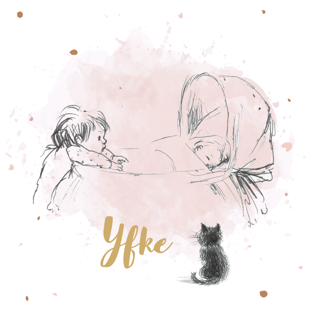Geboortekaartje met een pentekening voor een tweede kindje van een kindje kijkend naar de baby over het randje van de wieg met een roze waterverfvlek en confetti. (21956)