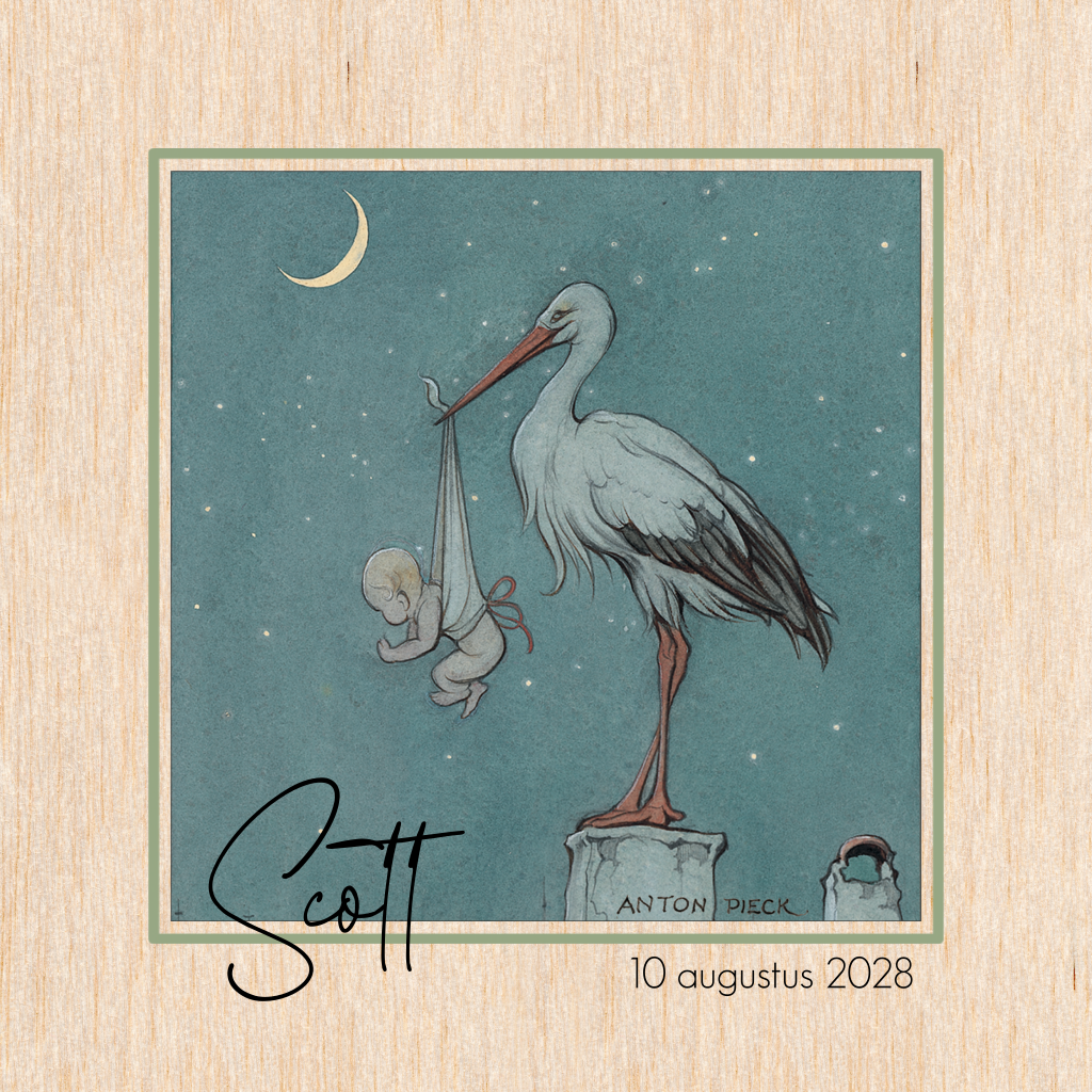 Geboortekaartje op hout Anton Pieck ooievaar in nacht