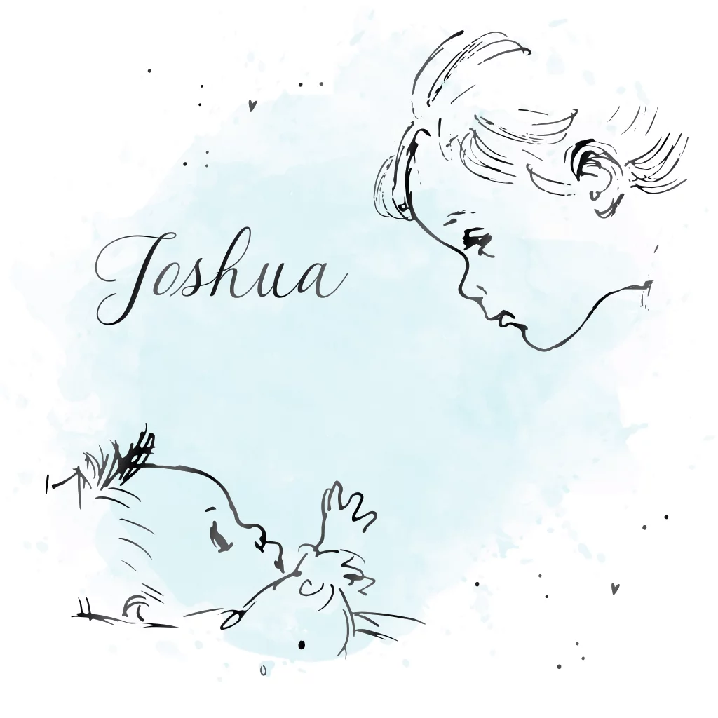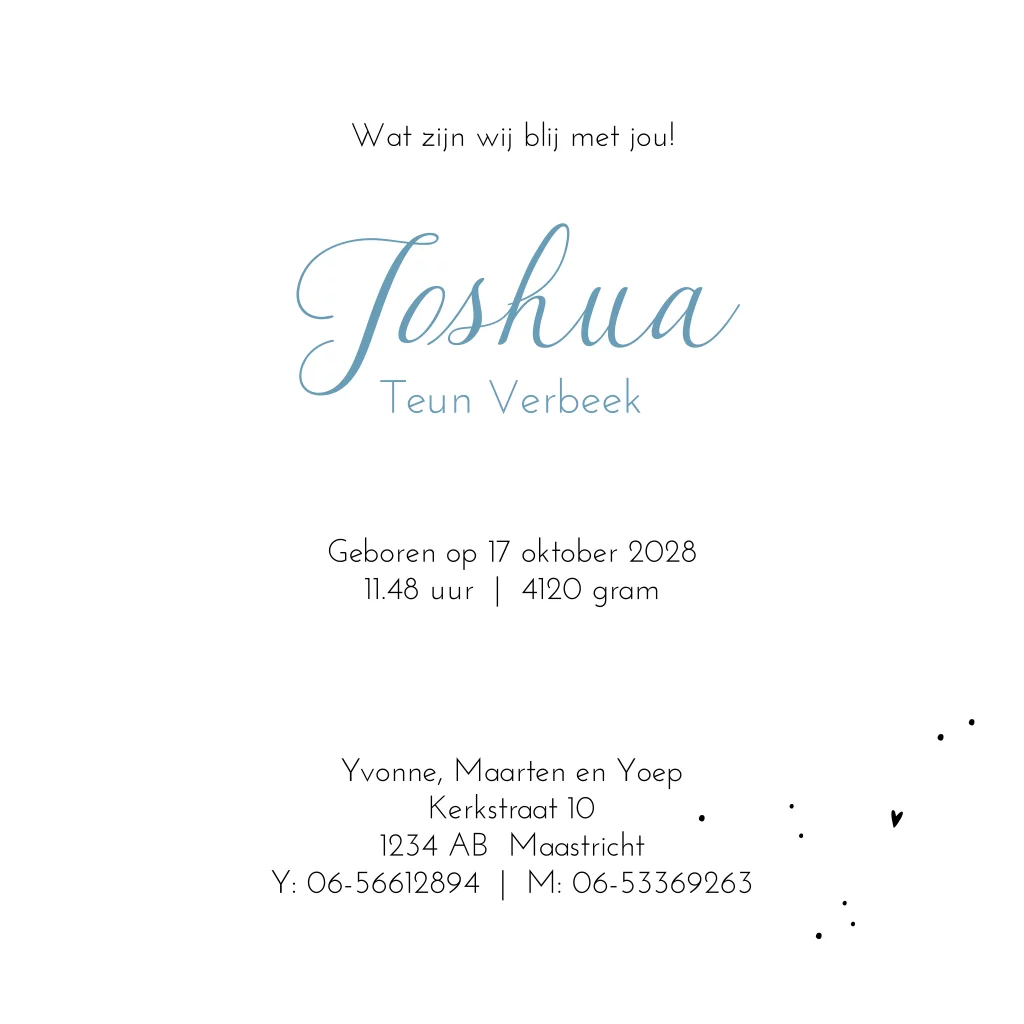 Geboortekaartje 2e kindje jongen met een pentekening voor een tweede kindje met de afbeeldingen, de hartjes en stipjes in zwartfoliedruk. Op de achtergond blauwe waterverf. (23581)