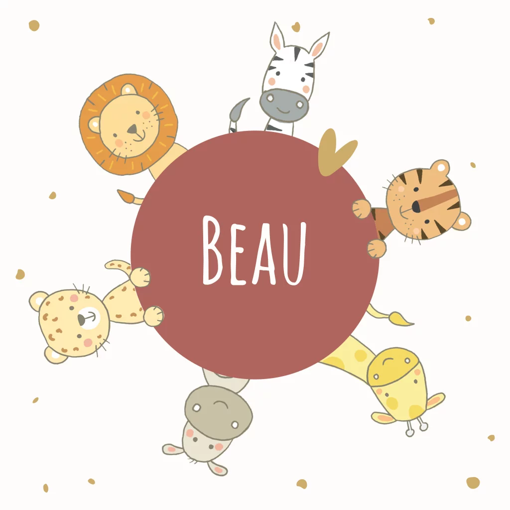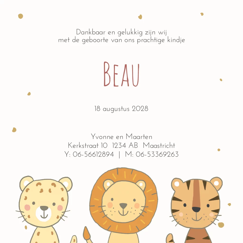 Geboortekaartje meisje of jongen met 6 verschillende getekende safari dieren om een cirkel met confetti en een klein hartje. (22132)