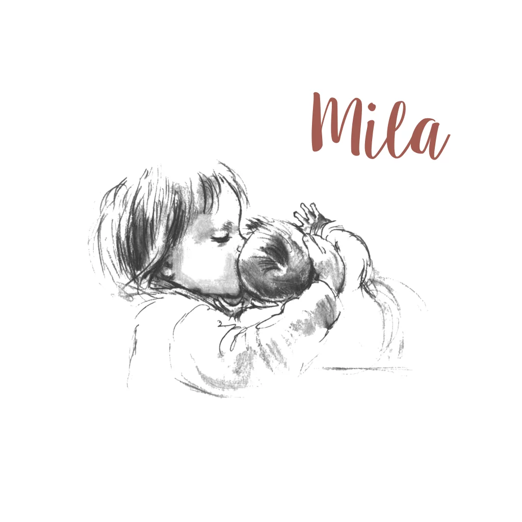 Geboortekaartje 2de kindje met pentekening getekend in zwartdruk mete en retro-look. Grote zus / broer geeft baby een kus. (21974)