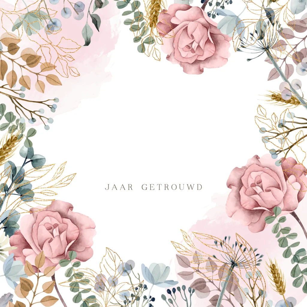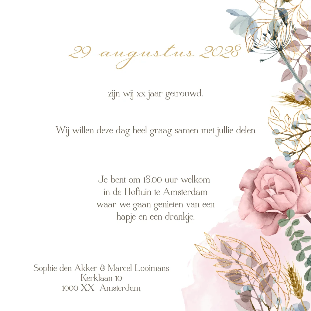 Jubileum uitnodiging met een kader van verschillende bloemen en takjes met watercolor in de achtergrond en takjes in goudlook en de namen in goudfolie. (23164)