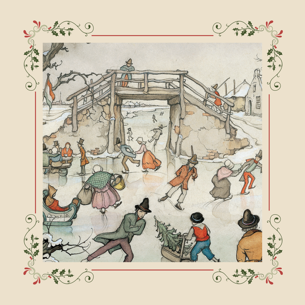 Kerstkaart met een afbeelding van Anton Pieck met schaatsende mensen onder een brug met eromheen een sierlijk kader van hulst takjes. (22759)