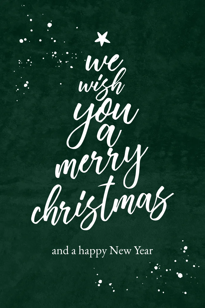 Enkele kerstkaart met ronde hoeken met een donkergroene achtergrond met de tekst "we wish you a merry Christmas" in de vorm van een kerstboom. Alle tekst, de ster en de spetters aan de voorzijde staan in goudfolie. (24292)
