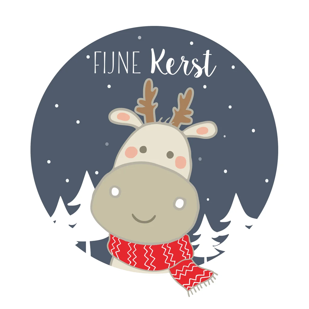 Kerstkaart van een vrolijk nijlpaard met een rode sjaal op een donkerblauwe cirkel met sneeuwvlokken en kerstbomen. (23436)