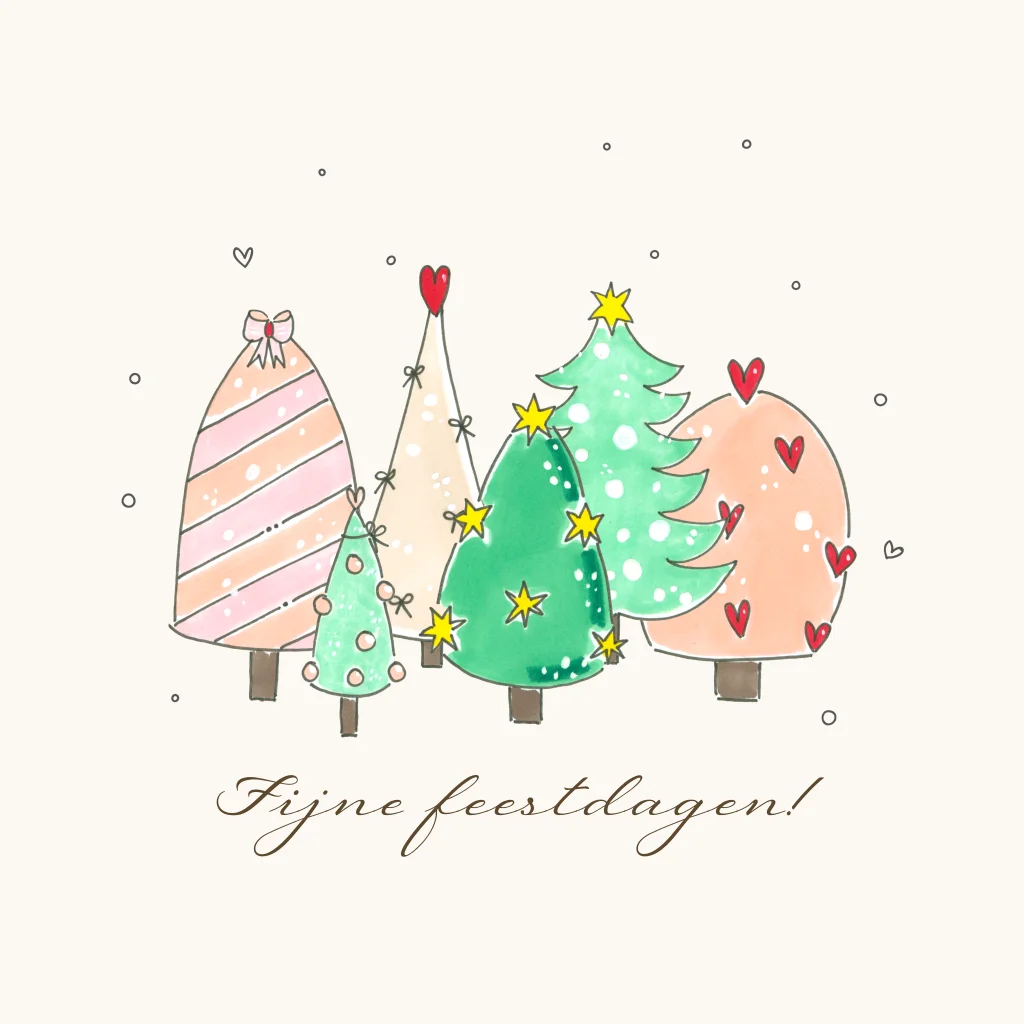 Vrolijke vierkante kerstkaart met 6 verschillende gekleurde en gevormde kerstboompjes. Alle tekst is aanpasbaar. (24290)
