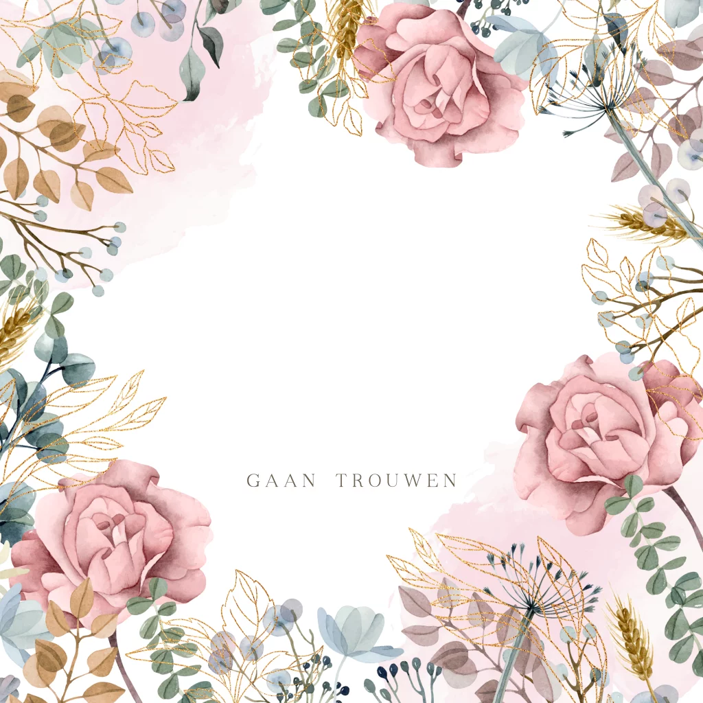 Trouwkaart met een kader van verschillende kleurrijke bloemen en takjes met watercolor in de achtergrond en takjes in goudlook en de namen in goudfolie. (23164)