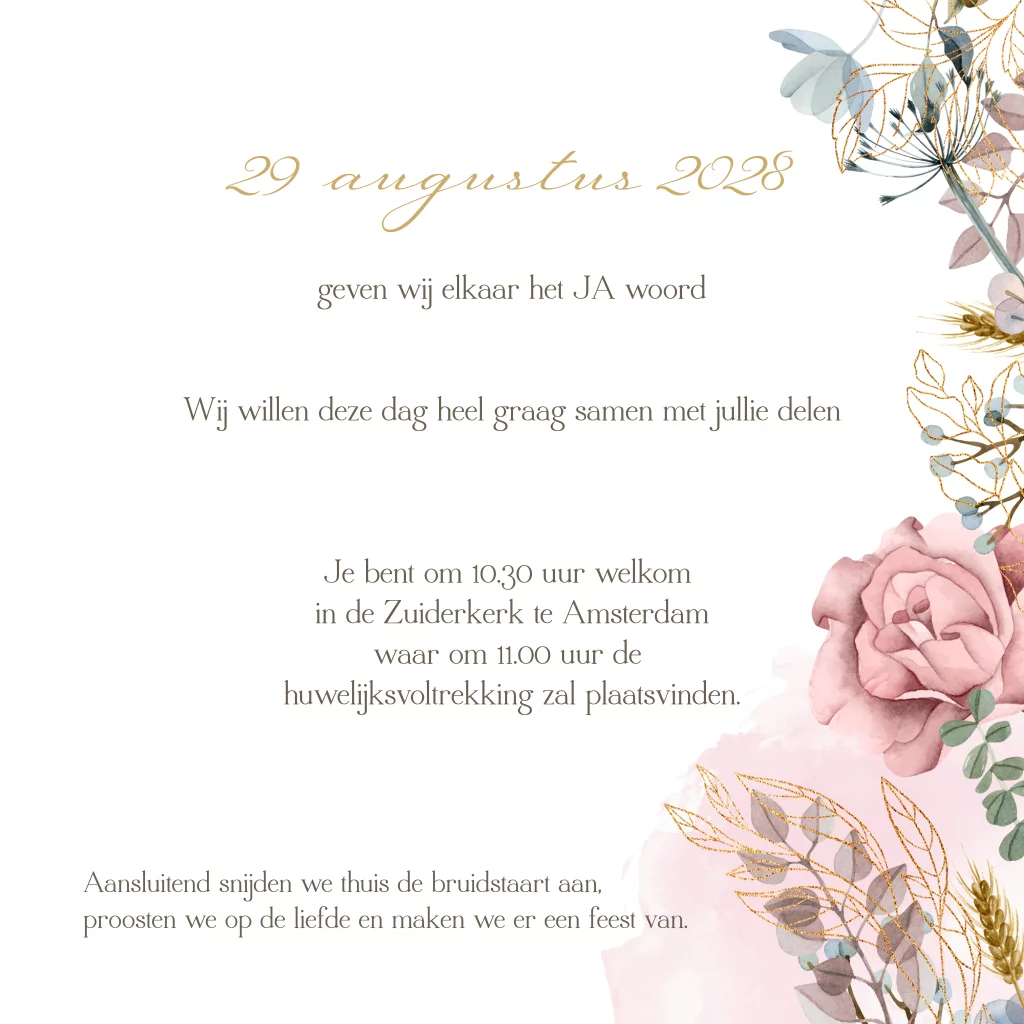 Trouwkaart bloemen met takjes in goudlook