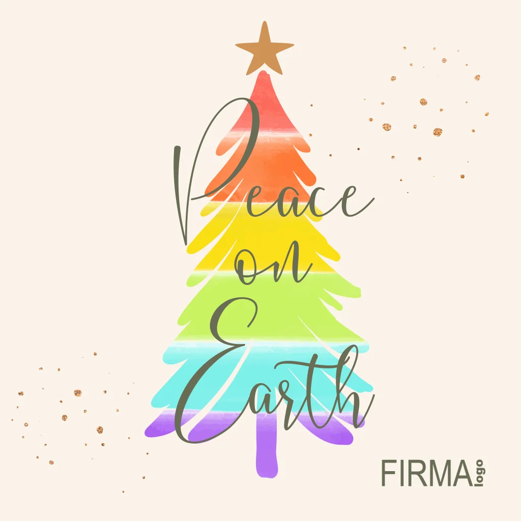 Kerstkaart met een kerstboom in regenboog kleuren met de tekst Peace on Earth en stippen in goudlook. (23818)