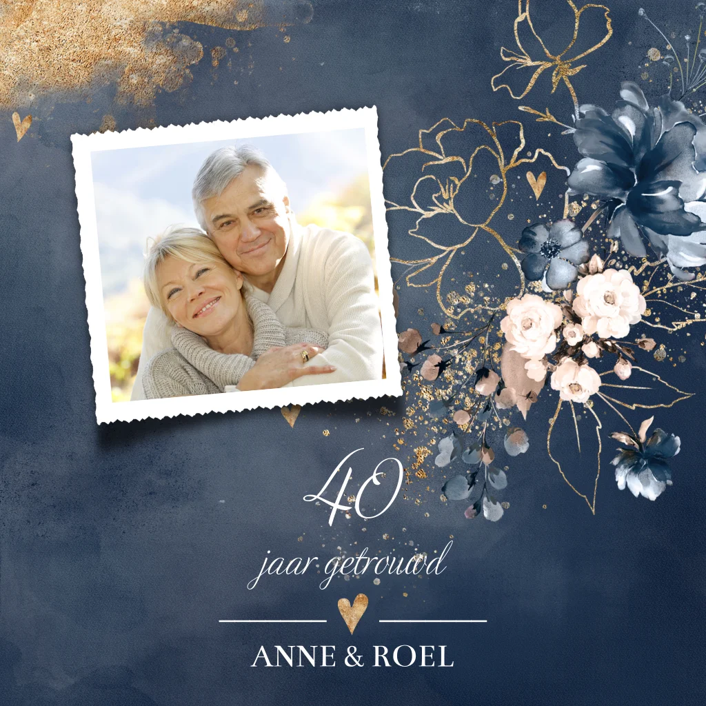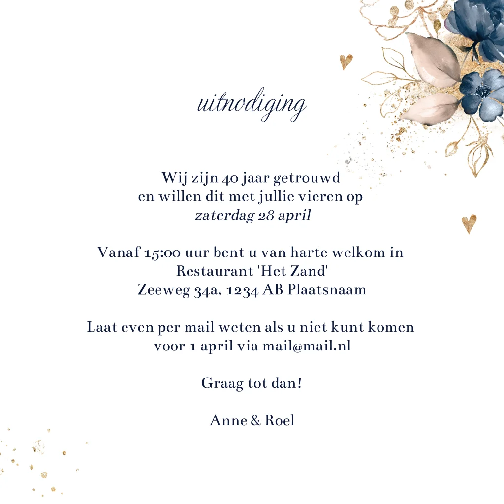 40 jaar getrouwd uitnodigingskaart etentje met goudkleurige details, blauwe bloemen en confetti. (445566)