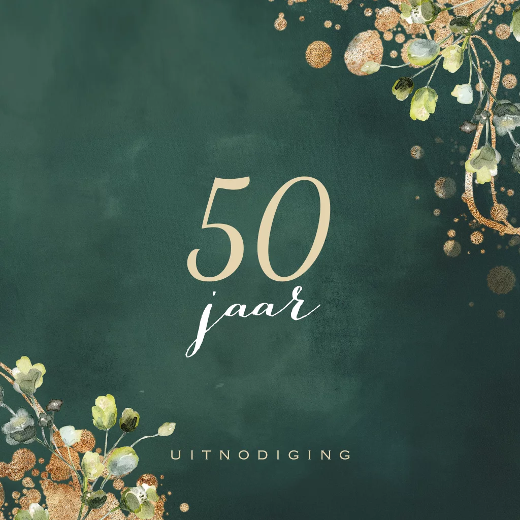 Moderne uitnodiging 50 jaar verjaardag met groene achtergrond en goud look element. (24150)