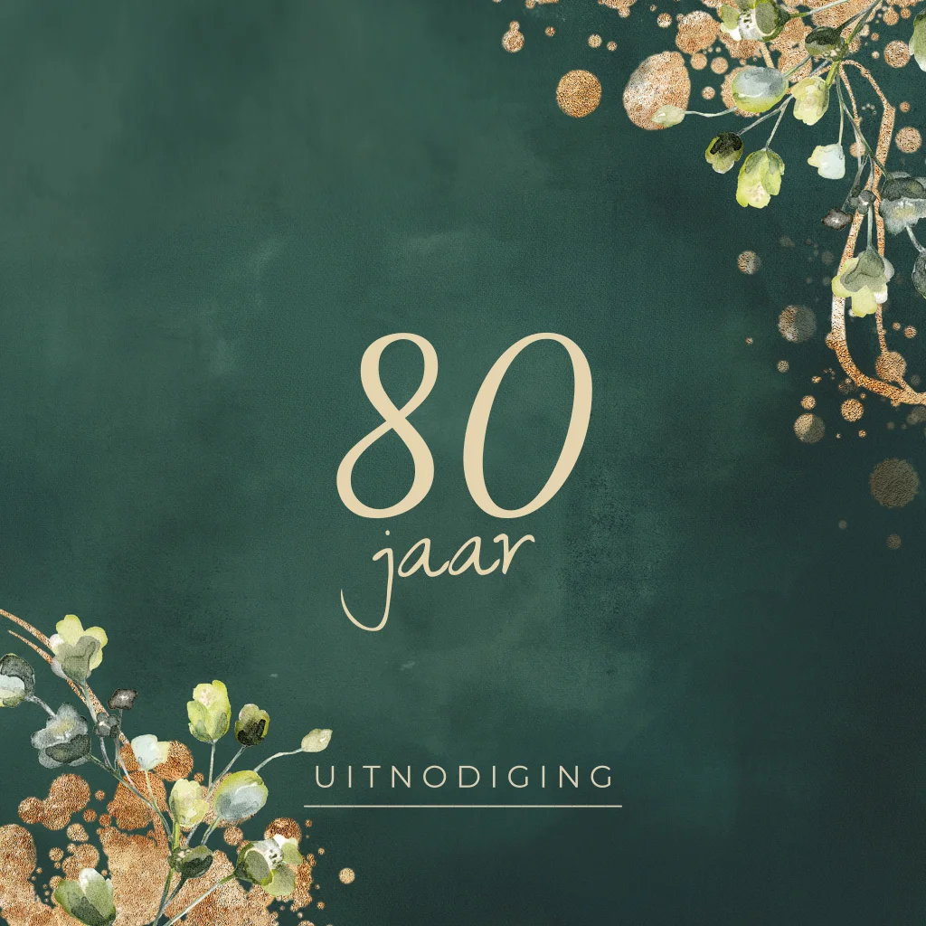 Moderne takjes en bloemen uitnodiging 80 jaar verjaardag met groene achtergrond en goud look element. (24150) (Deze kaart heeft nu ronde hoeken a € 0,30 extra per kaart, in je kunt dit ook met rechte hoeken bestellen)