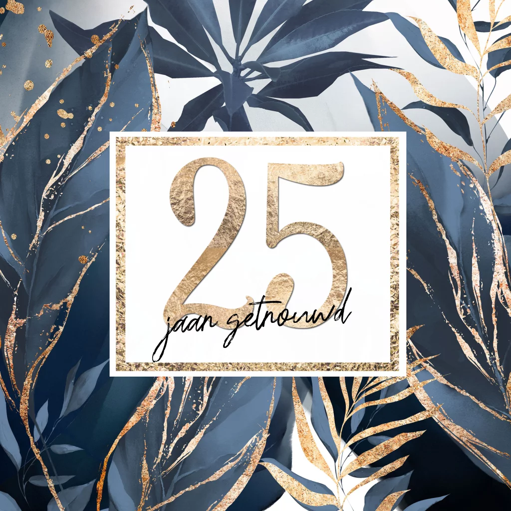 Uitnodiging 25 jaar getrouwd jubileum blauw met goudkleurige bloemen. (23289) Wil je een ander jaartal in dezelfde stijl, neem dan contact met ons op, je kunt dit helaas niet zelf aanpassen of je moet een 'gewone' tekst plaatsen.