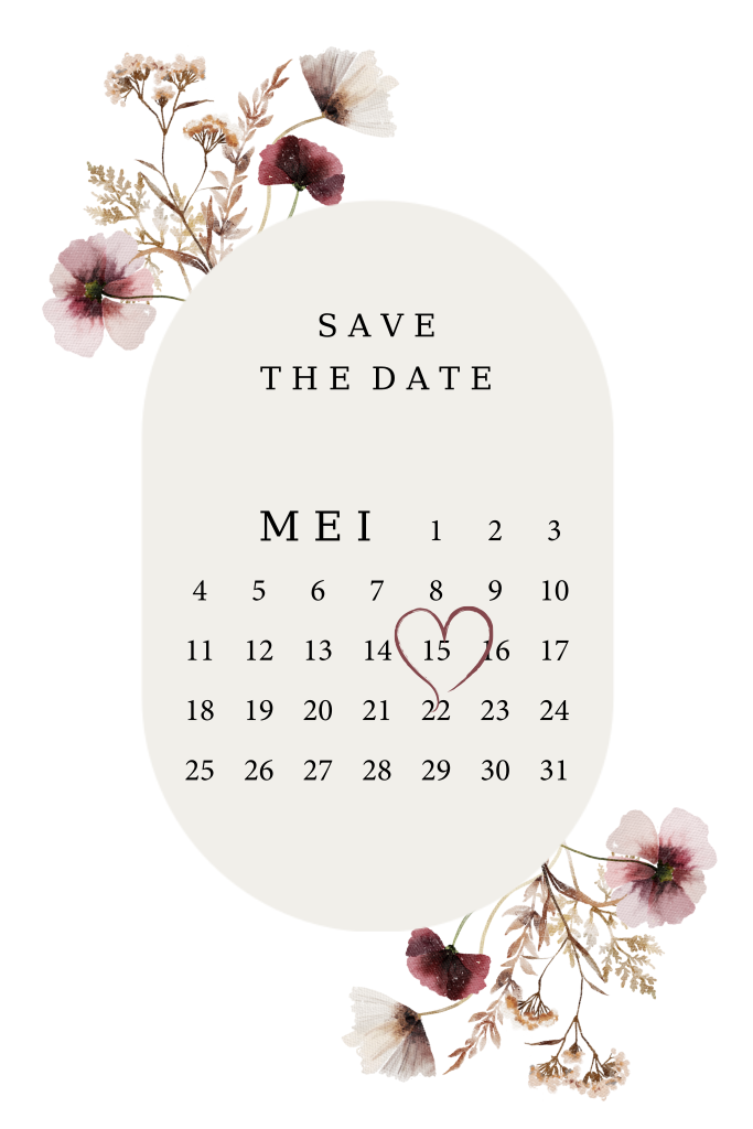 Save the date kaart warme kleuren met bloemen en kalender. (23513)