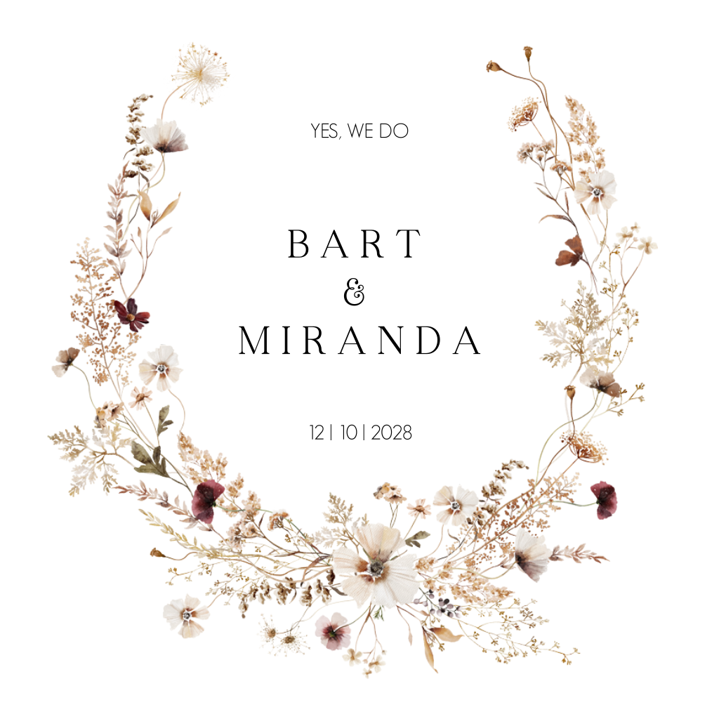 Trouwkaart botanisch met bloemen in een krans. (23358)