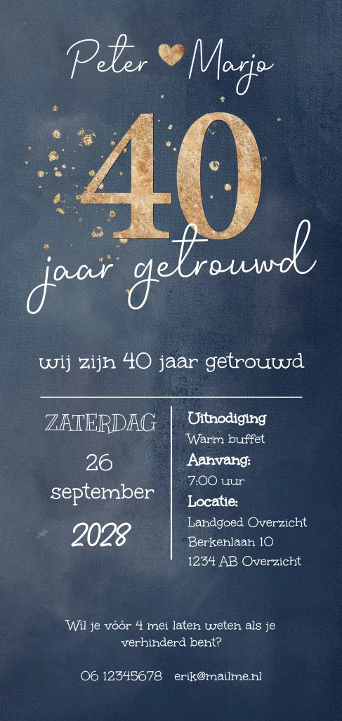 Donkerblauwe 40 jaar getrouwd uitnodiging grafisch