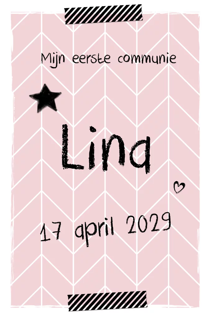 Hippe kaart eerste communie met roze streep patroon. (23580)