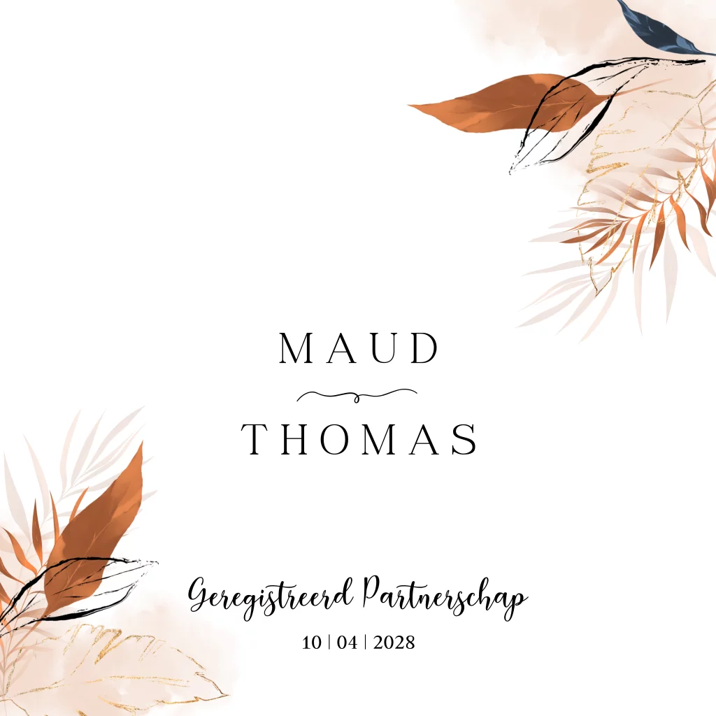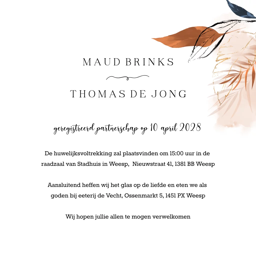 Waterverf uitnodiging geregistreerd partnerschap met exotische blad. (23554)