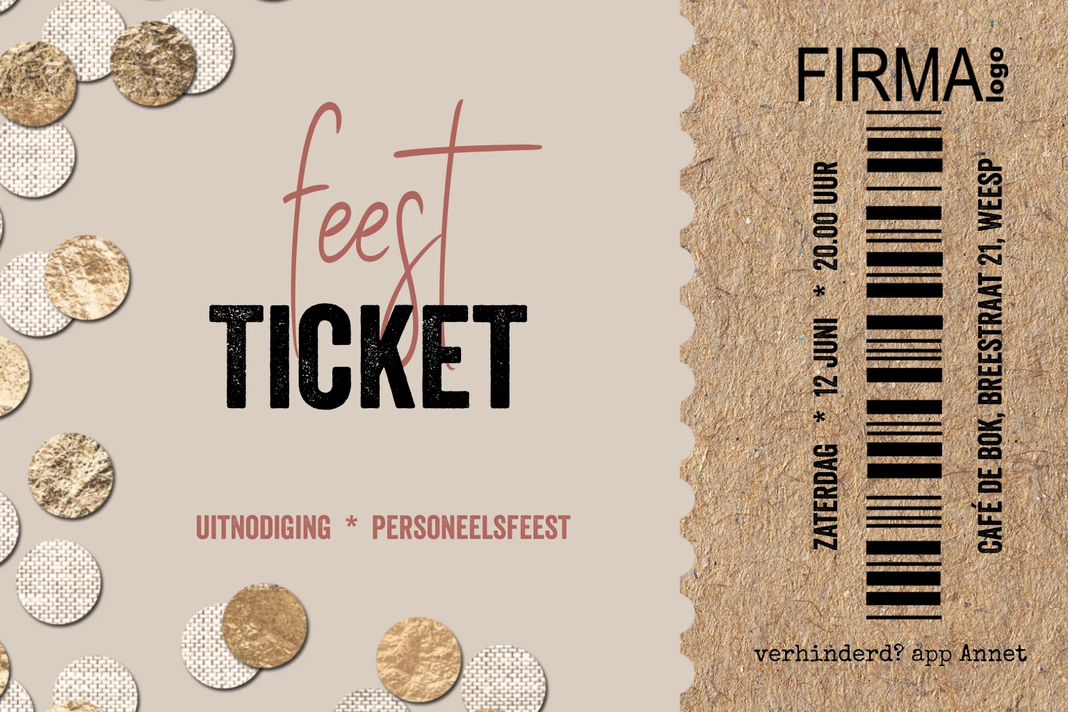 Personeelsfeest uitnodiging feestelijke party ticket. (23413) Teksten en bedrijfslogo zijn aanpasbaar.