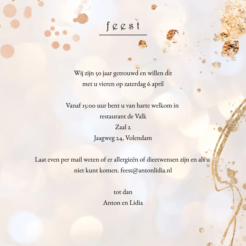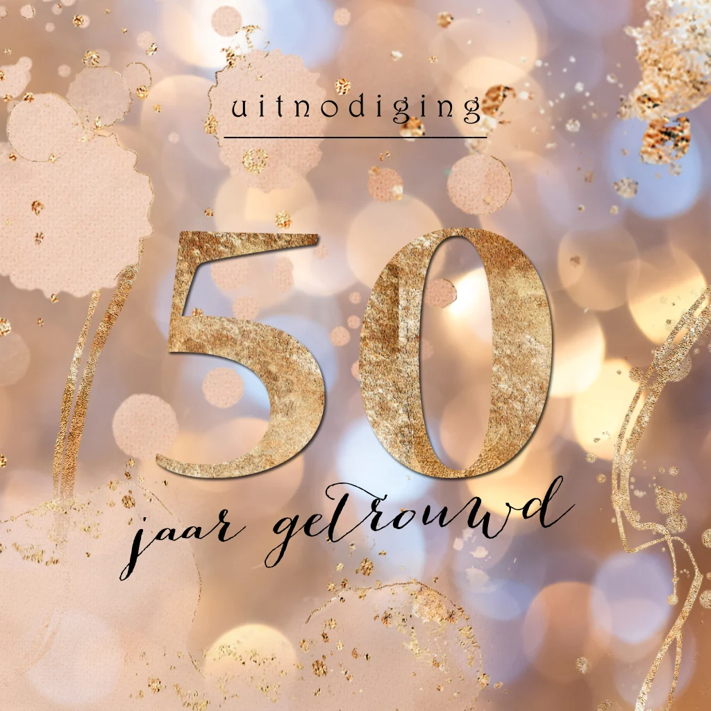Uitnodiging voor een jubileumfeest 50 jaar getrouwd kaarten met warme kleuren confetti, spetters en goud look. (23719) Wil je een ander jaartal in dezelfde stijl op de kaart? Kijk bij afbeeldingen > cijfers of neem contact met ons mee. We zetten dit gratis voor je om.