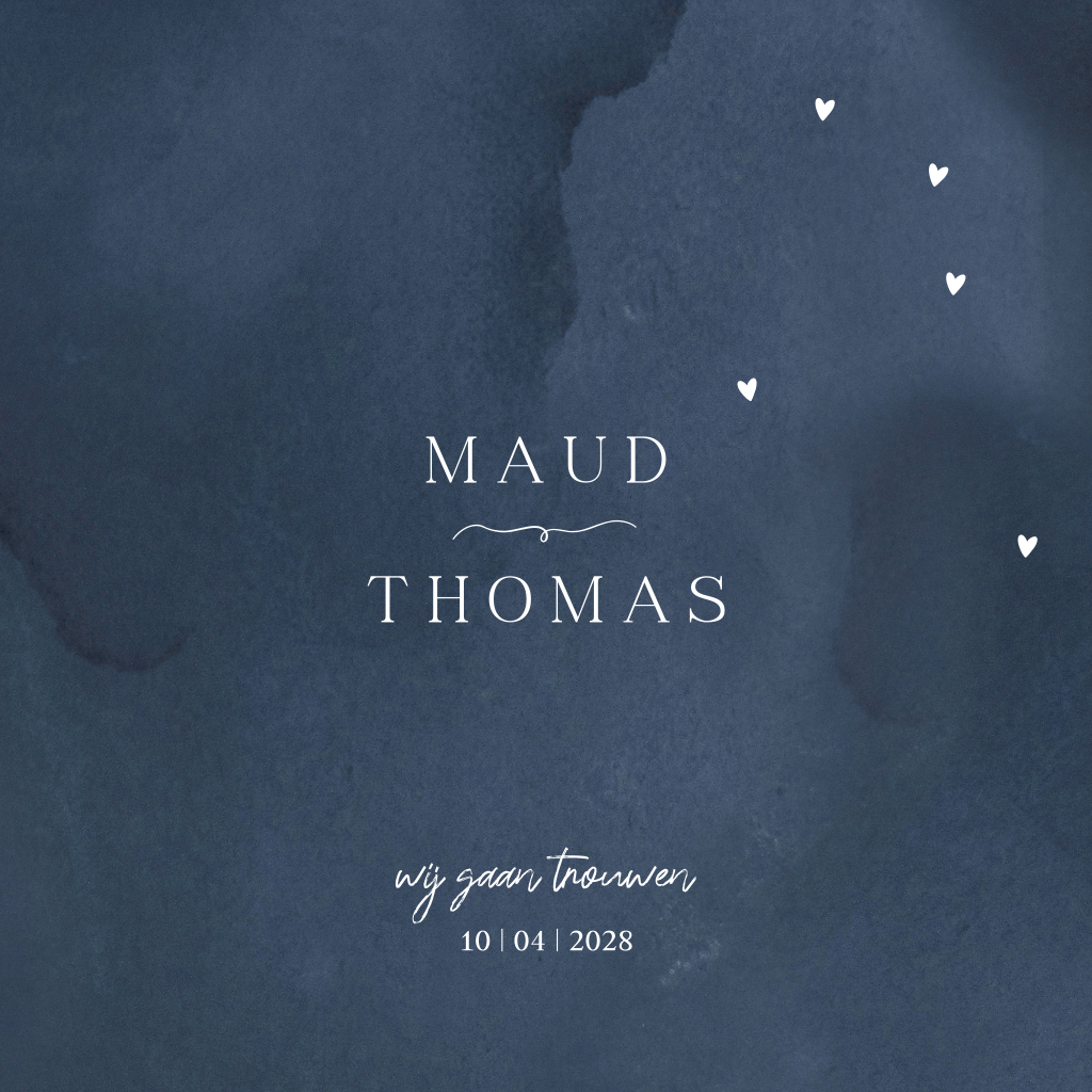 Moderne trouwkaart blauw aquarel, hartjes en goudfolie. (23319)