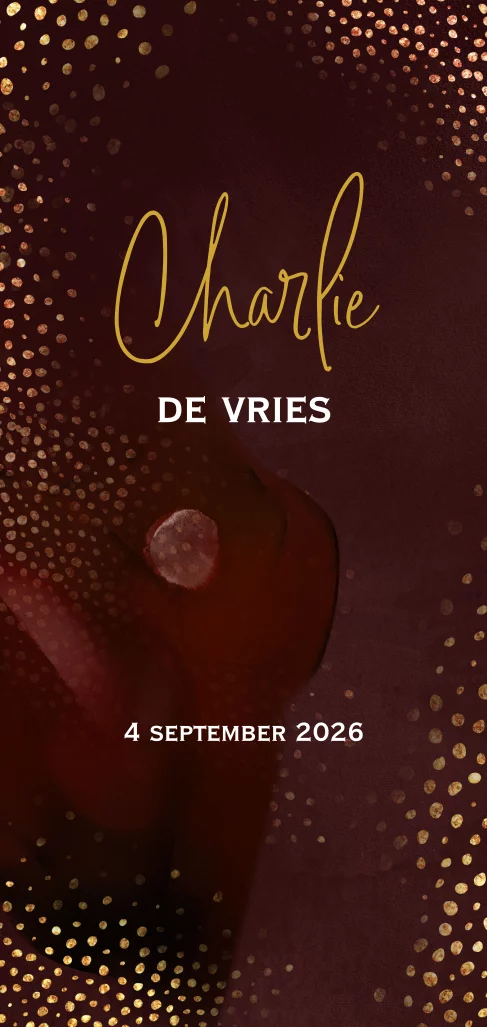 Warm gekleurd geboortekaartje unisex rood bruin met goudlook confetti en ronde hoeken. (2343) Geboortekaartje Charlie.