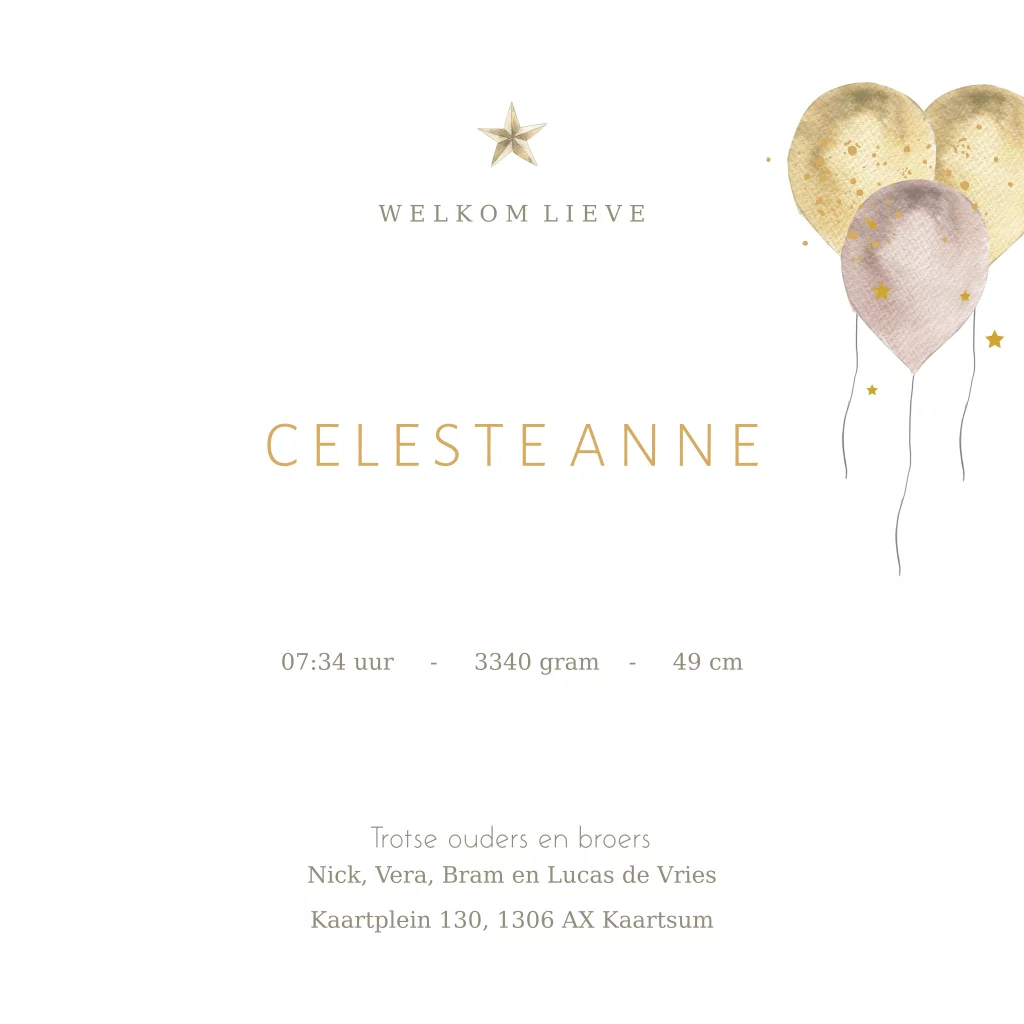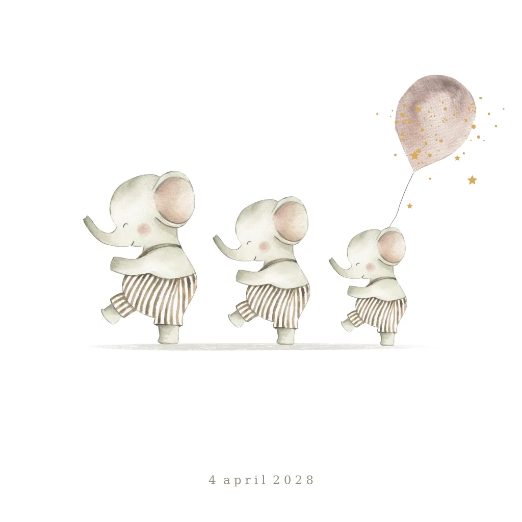 Geboortekaartje 3e kindje met familie olifant en roze ballon