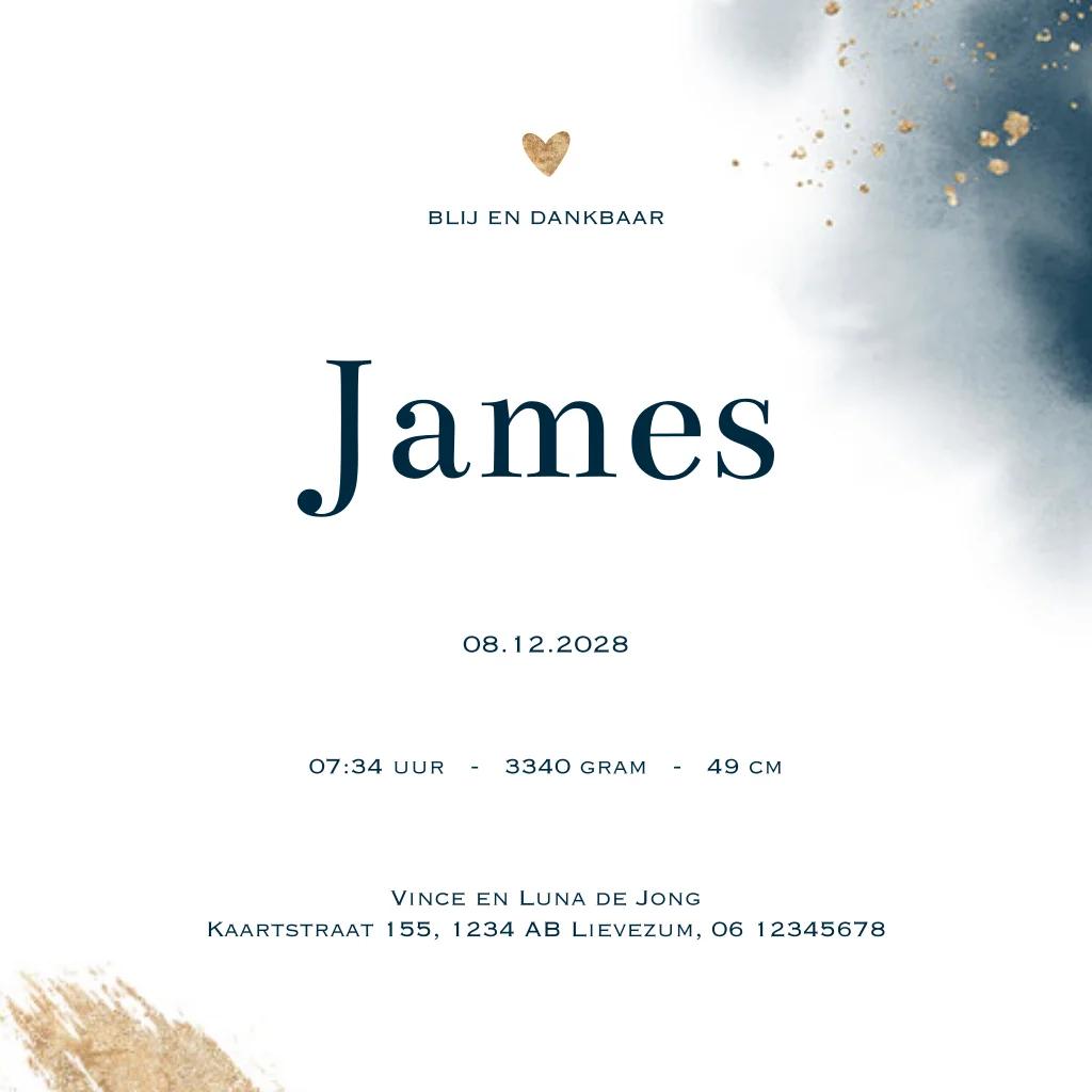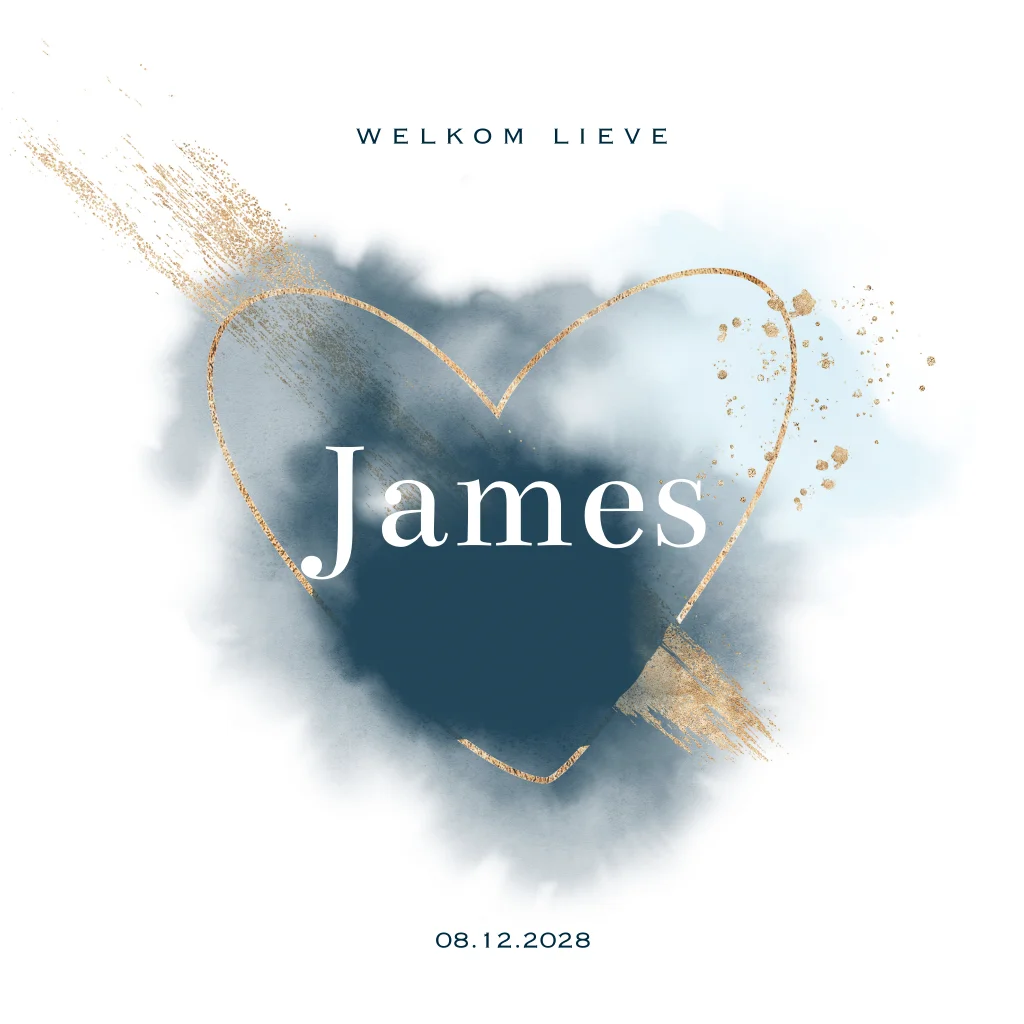 Geboortekaartje jongen blauw aquarel hart en goudlook details. (23329) geboortekaartje James