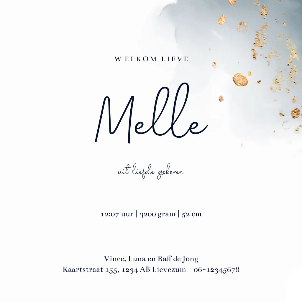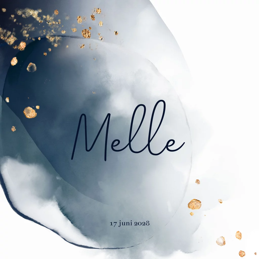 Geboortekaartje jongen met goudlook spetters en blauw aquarel op de achtergrond. (23590) Geboortekaartje Melle