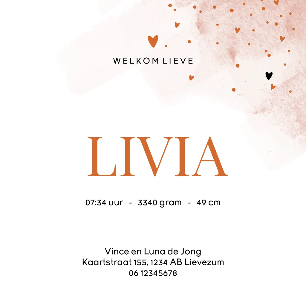 Geboortekaartje meisje Livia met watercolor roze en foliedruk