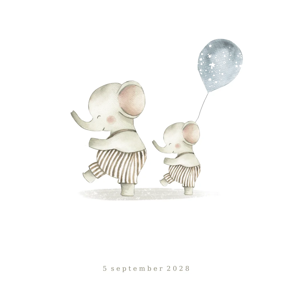 Lief geboortekaartje voor de geboorte van een broertje met olifanten en ballon. (23935)