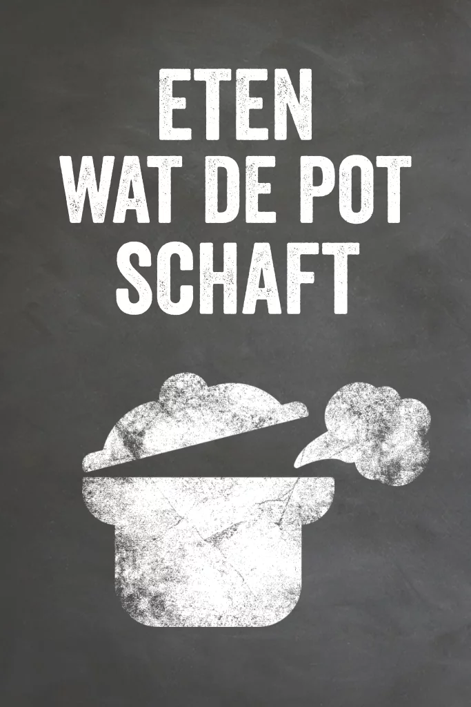 Grappige uitnodiging voor een etentje. Krijtbord achtergrond met de tekst: Eten wat de pot schaft. (23585)