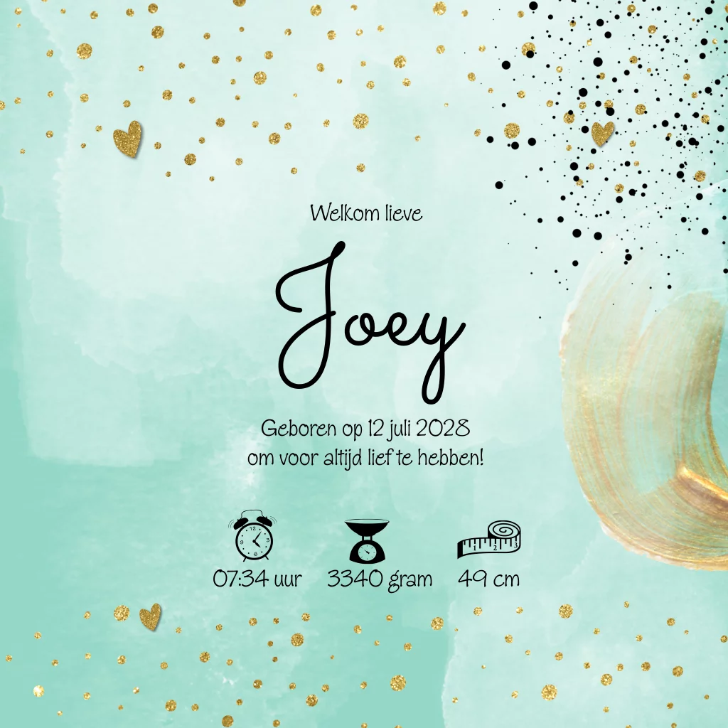 Hip geboortekaartje jongen met mint groene aquarel en goudlook hartjes en spetters. (23904)