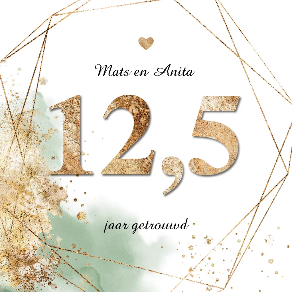Een moderne kaart voor een 12,5 jaar samen getrouwd huwelijks jubileum. Groene watercolor en goud look versiering. (23706) Wil je een ander jaartal in dezelfde stijl op de kaart? Kijk bij afbeeldingen > cijfers of neem contact met ons mee. We zetten dit gratis voor je om.