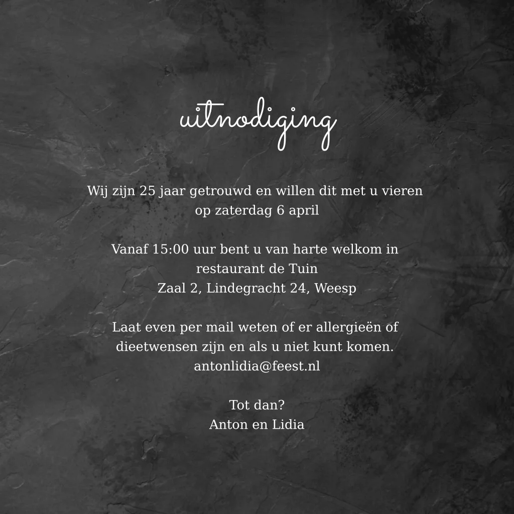 25 jarig jubileum uitnodiging met krijtbord kleur achtergrond en jaartal in houtlook. Wil je een ander jaartal in dezelfde stijl, neem dan contact met ons op, je kunt dit helaas niet zelf aanpassen of je moet een 'gewone' tekst plaatsen.(23269)