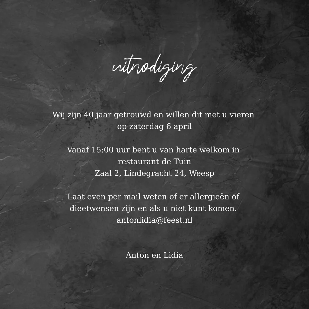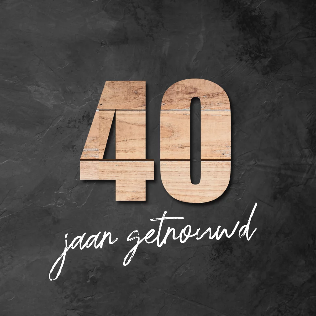 Stoere jubileum uitnodiging 40 jaar getrouwd met krijtbord kleur achtergrond en jaartal in houtlook. (23269) Wil je een ander jaartal in dezelfde stijl, neem dan contact met ons op, je kunt dit helaas niet zelf aanpassen of je moet een 'gewone' tekst plaatsen.