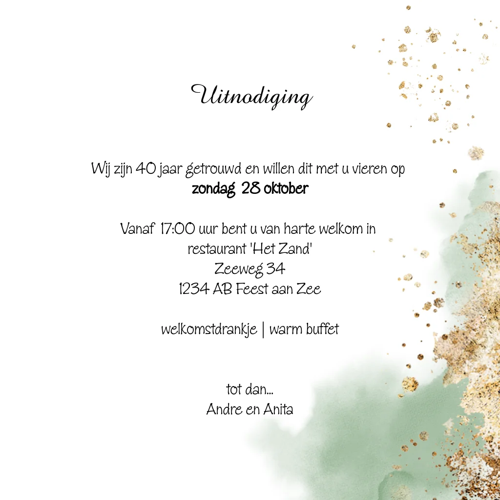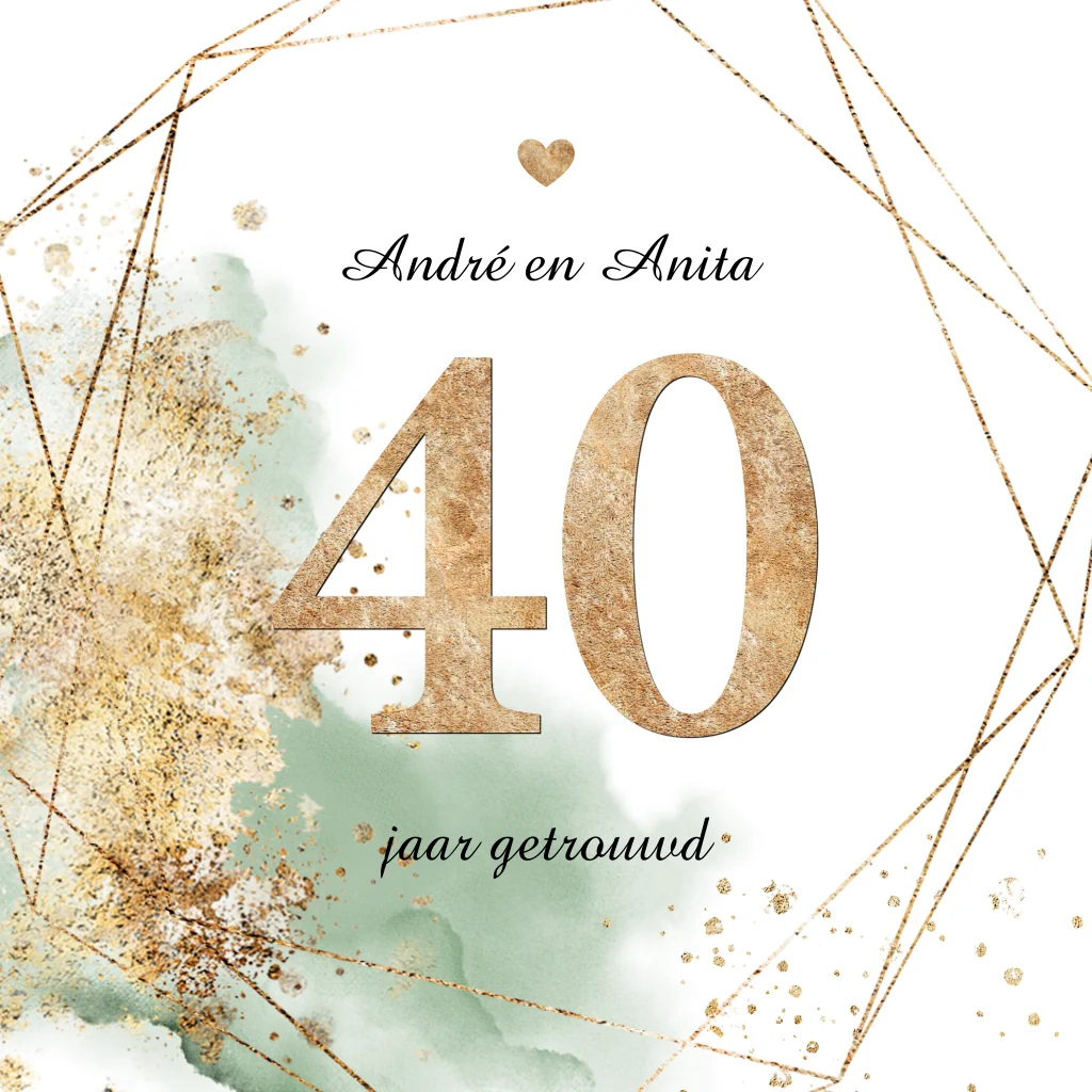Een moderne uitnodigingskaart voor een 40 jaar getrouwd huwelijks jubileum. Groene watercolor en goud look versiering. (23707) Wil je een ander jaartal in dezelfde stijl op de kaart? Kijk bij afbeeldingen > cijfers of neem contact met ons mee. We zetten dit gratis voor je om.