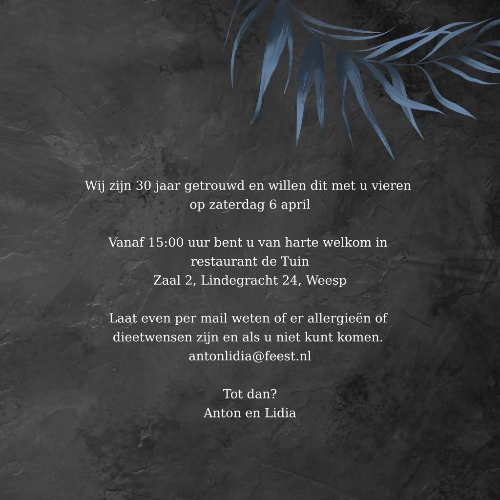 30 jaar getrouwd uitnodiging feestje krijtbord achtergrond en blad. (23267) Wil je een ander jaartal in dezelfde stijl, neem dan contact met ons op, je kunt dit helaas niet zelf aanpassen of je moet een 'gewone' tekst plaatsen.
