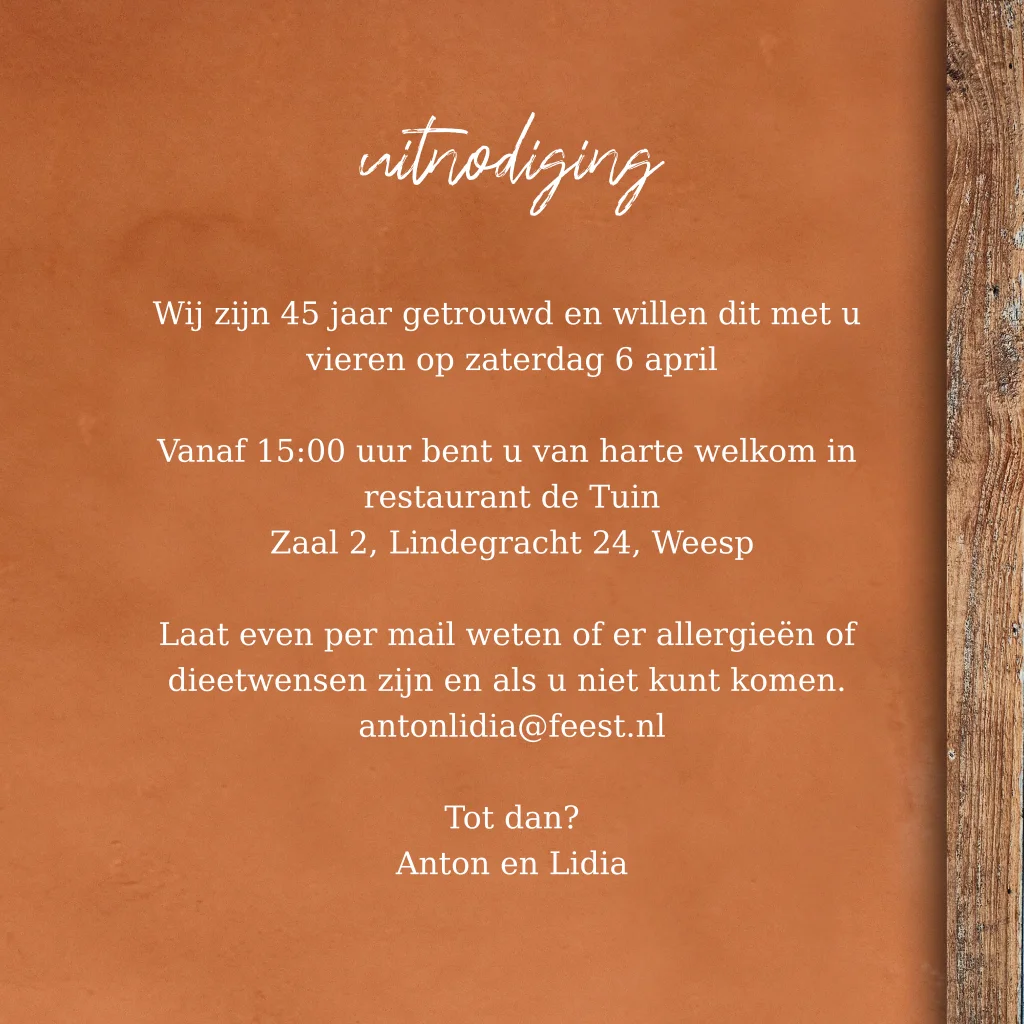 Jubileum uitnodiging 45 jaar getrouwd met oranje hart en hout