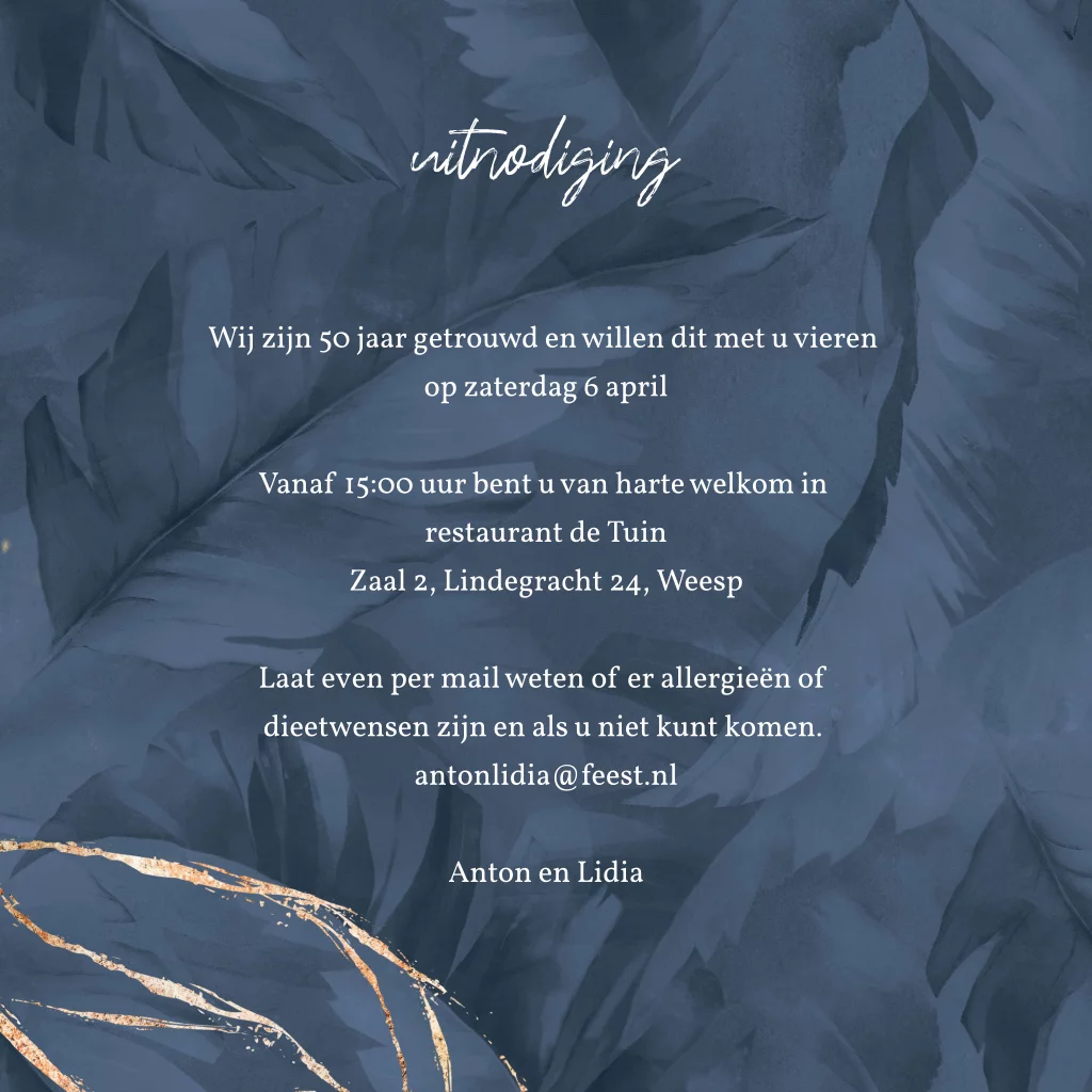 Prachtige jubileumkaart uitnodiging 50 jaar blauw met goudkleurige